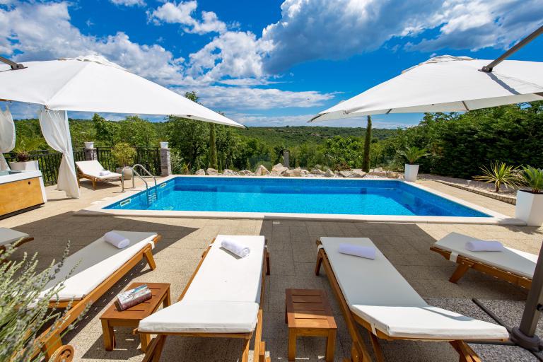 U kunt genieten van een privé jacuzzi met hydromassage en een groot zwembad met open panoramisch uitzicht op de berg Učka en het groen, deze charmante villa is gebouwd om een ontspannen en rustige vakantie in het pittoreske Istrische platteland te bieden.